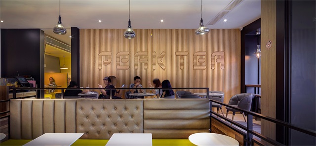 考虑到峯茶对茶饮“纯天然、无添加”的品质坚持,设计师在该空间中着重展现一种返璞天然的品牌气质,大面积使用木元素,将木艺的质感与清新的茶味搭配起来,营造出醇厚质朴的氛围。由于峯茶将消费群体主要定位为“80后、90后为主的年轻人及在周边上班的人士”,因此客户希望能在空间设计上体现“年轻化、个性化”的氛围,设计师巧妙地用木元素变化出不同的线条与几何图形,赋予了实木活泼灵动的气息。密布折角线条的木艺墙面和镶嵌着品牌LOGO的竖木纹墙面给人以强烈的视觉冲击感,与宽度更大的木地板相映成趣,一疏一密之间尽显动感愉悦。