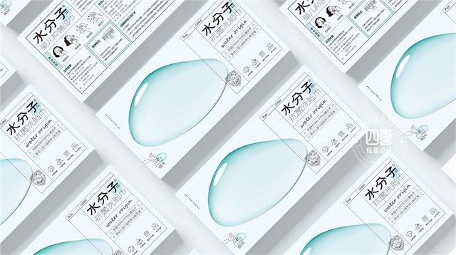 水分子湿巾包装设计,我们用一个识别符号强化品牌的传播。将水滴造型抽象出来。通过视觉塑造,将水分子这样工业化的名字变成一个给人柔软舒适的视觉感受。去强化水分子洗脸巾的品类特性。
