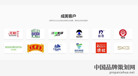 迄今为止,成美已将多个品牌从当年的弱势打造成为行业领导者,如:红罐王老吉(加多宝)、江中健胃消食片、百雀羚草本护肤、西王玉米油……除此之外,成美还为众多不同领域的大中型企业制定品牌定位,如: 红杉资本、巨人集团脑白金公司、燕京啤酒集团、利乐(Tetra Pak)中国、中粮集团、康美药业、哈药集团、 维达纸业集团、广药集团、中国中药公司、香港维他奶公司、KKR中国基金……均获得极高的客户满意度及回头率。