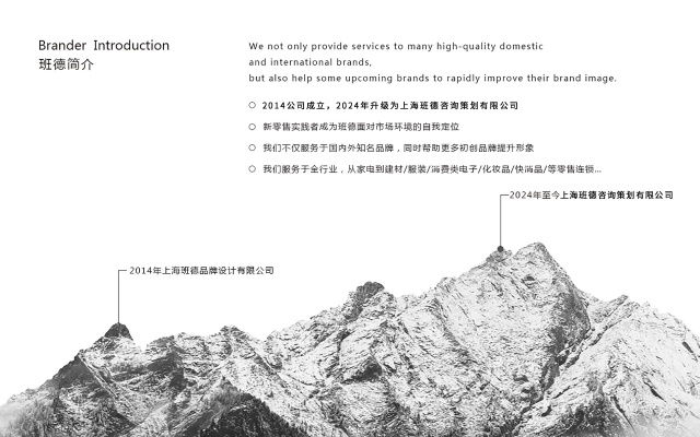 公司简介:2014公司成立,2024年升级为上海班德咨询策划有限公司 新零售实践者成为班德面对市场环境的自我定位